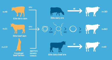 Oocytes were collected weekly for up to 9 weeks using transvaginal ovum pick-up from elite dairy donors (ET-DAIRY; n = 40; Holstein-Friesian and Jersey) and elite beef donors (ET-ELITE-BEEF; n = 21; Angus). Both heifers and cows were included in these donor groups. Additionally, oocytes were collected from the ovaries of beef heifers of known pedigree following slaughter (ETCOMM-BEEF; n = 119). After in vitro maturation, fertilization, and culture, single Grade 1 blastocysts were transferred either fresh or after freezing and on-farm thawing into lactating Holstein-Friesian dairy cows synchronized with a 10-day PRID-Ovsynch protocol. On day 0, cows received a 2-mL intramuscular injection of GnRH analogue (Ovarelin, 100 μg of gonadorelin diacetate tetrahydrate; Ceva Sante Animale, Libourne, France) and a progesterone-releasing intravaginal device (PRID Delta; 1.55 g Progesterone, Ceva). On day 7, a 5-mL intramuscular injection of PGF2α (Enzaprost, 25 mg of dinoprost trometamol; Ceva) was administered, followed by a second 5-mL injection of PGF2α on day 8 and removal of the PRID. On day 9.5 (32 hours after PRID removal), a second intramuscular injection of GnRH was given. On day 10, 243 cows received AI (16 hours after the second GnRH), and 863 cows were assigned to receive ET on day 17. Blood samples were collected on day 17 to evaluate serum P4 concentrations. Pregnancy rates were determined between days 32-35 after synchronized ovulation using transrectal ultrasonography. Pregnancy was confirmed between days 62-65 to determine embryonic loss. Pregnancy data were analyzed using generalized linear mixed models, with service treatment (TAI vs. TET) as a fixed effect.