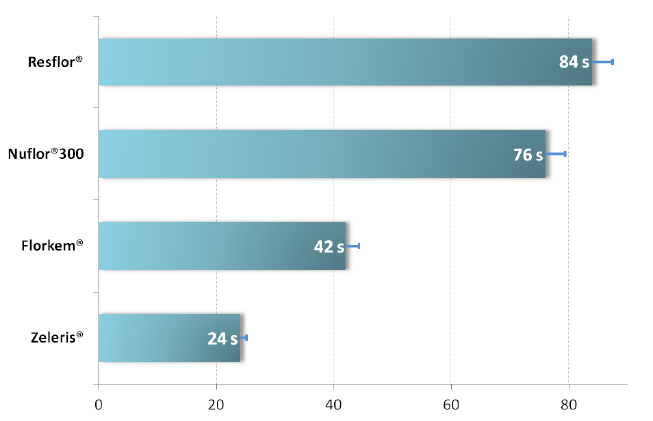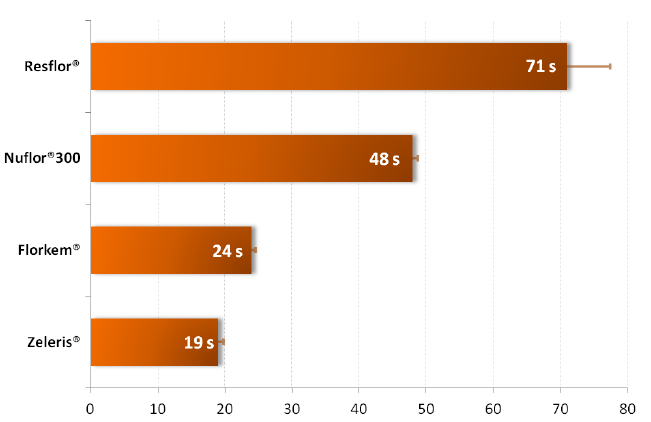 The results of this study clearly demonstrated the high syringeability of the new fixed combination of florfenicol and meloxicam (Zeleris®). Zeleris® syringeability was better than the other florfenicol-based products both at 5°C and at room temperature (figure 1 and 2). The superior performances of Zeleris® may be explained by the various excipients used in its formulation.